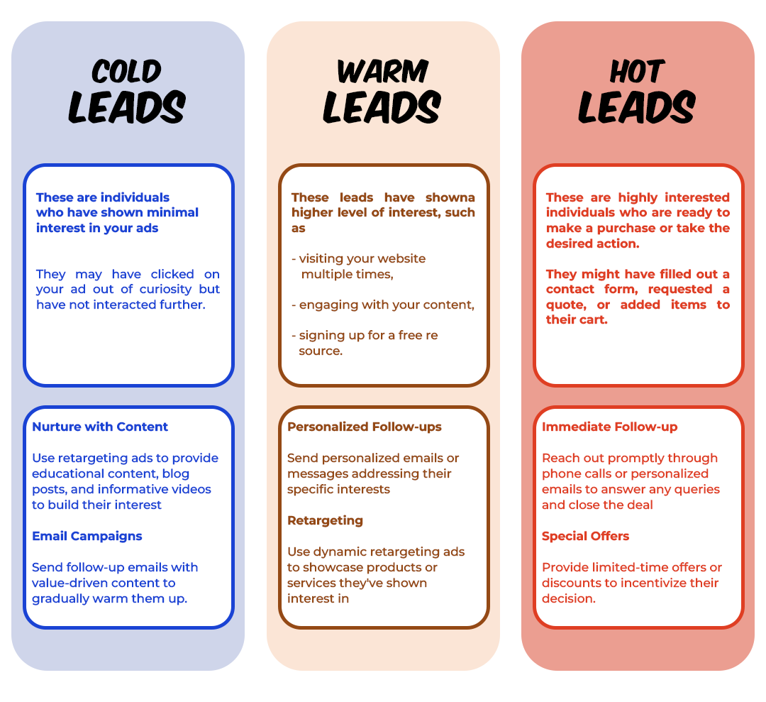 - Prioritize Leads: Based on leads’ interaction with ads and their alignment with the pre-defined customer profile, we segregate our leads into cold, warm, and hot based on their: